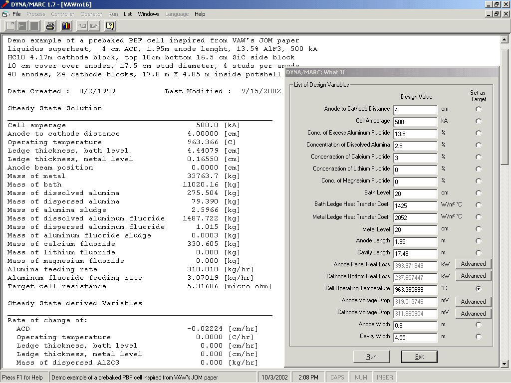 As described in [7], the lump parameters+ model has been recently upgraded by adding to it four new sub-models that computed the anode panel heat loss, the cathode bottom heat loss, the anode drop and the cathode drop. With the addition of these new sub-models, the lump parameters+ model also called Dyna/Marc 1.7 cell simulator [8] can be use stand-alone to do per example the thermo-electric design of a 500 kA cell starting from an existing design at 300 kA. Figure 1 and 2 respectively present Dyna/Marc 1.7 "What if" panel and the results of a trend analysis.