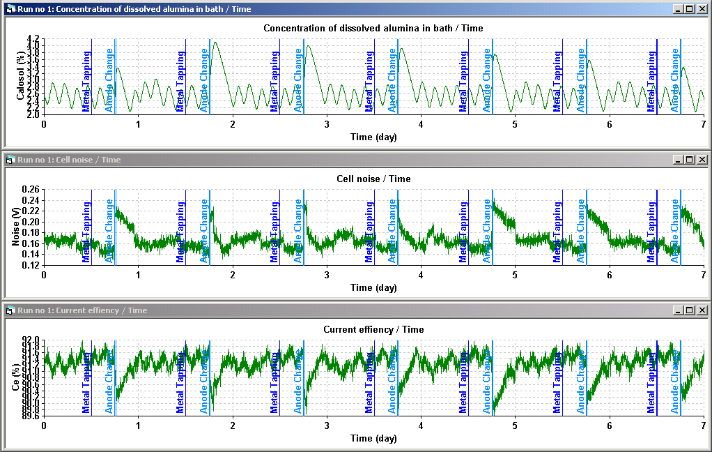 Dyna/Marc stands for Dynamic Model of aluminium reduction cell. It is a lump parameters+ model, the meaning of the "+" being described in a paper presented at the TMS conference this year [2]. Dyna/Marc can be used in different contexts. First, it can illustrate the behavior of the Hall-Héroult process in the context of a general purpose aluminium electrolysis training course. As an example, Figure 1 and 2 illustrate the impact of undesirable alumina feeding from the cover material during an anode change on the cell current efficiency.