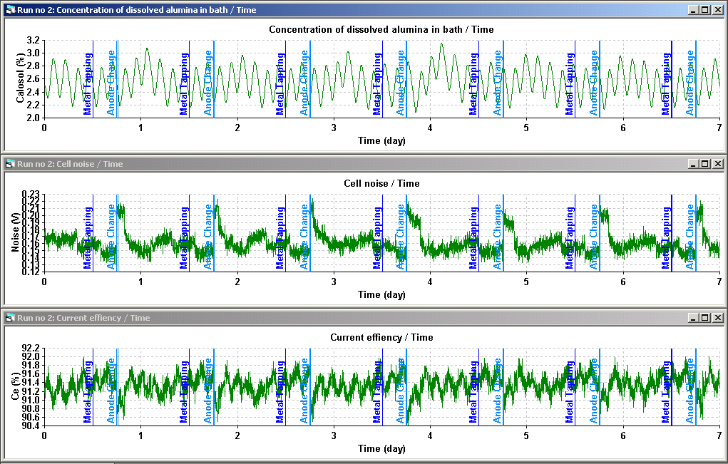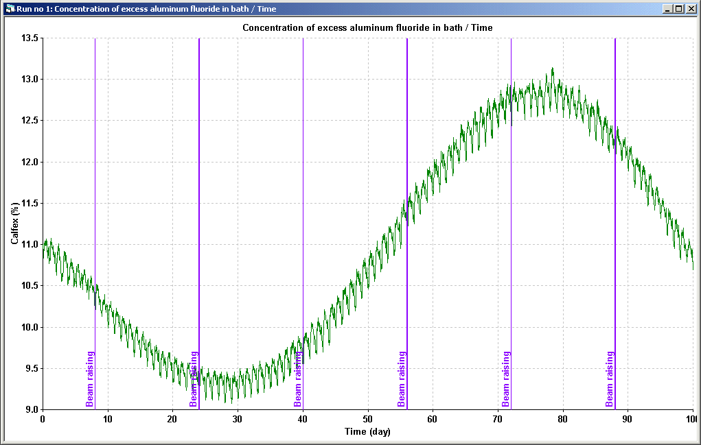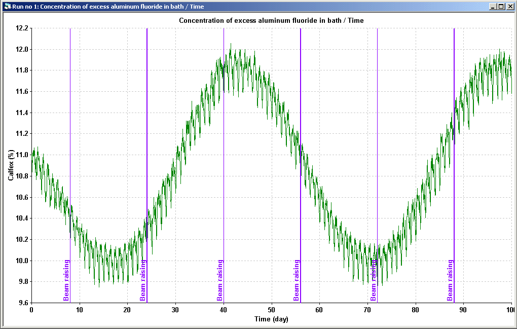 Dyna/Marc can also be used to test changes to the cell control logic or to train operators using a cell controller. As an example, VAW has developed a custom version of Dyna/Marc called Dyna/Marc-Elas and they use it to train new operators on their Elas cell controller. As another example on the application of Dyna/Marc in that field, Figure 3 and 4 illustrate the impact of changing the bath sampling frequency and the formula that is used to adjust the amount of AlF3 added to the cell on the long-term evolution of the bath chemistry.