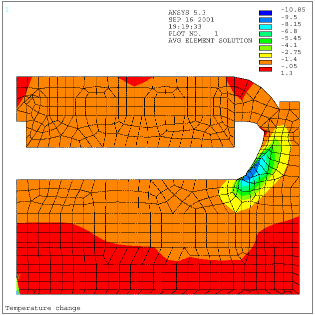 This loop was programmed in a .COM file in the VAX VMS environment. In that loop, ANSYS was called as a subroutine. The calculation of the new nodes position was computed in an external FORTRAN program also called as a subroutine in the .COM file. The mesh had obviously to be very crude as the extra geometry convergence loop added around an order of magnitude to the CPU time required by ANSYS to solve a fix geometry thermo-electric problem. In this first side ledge thickness convergence loop implementation, the solution from the previous loop was not use as initial guess to solve the next loop.
