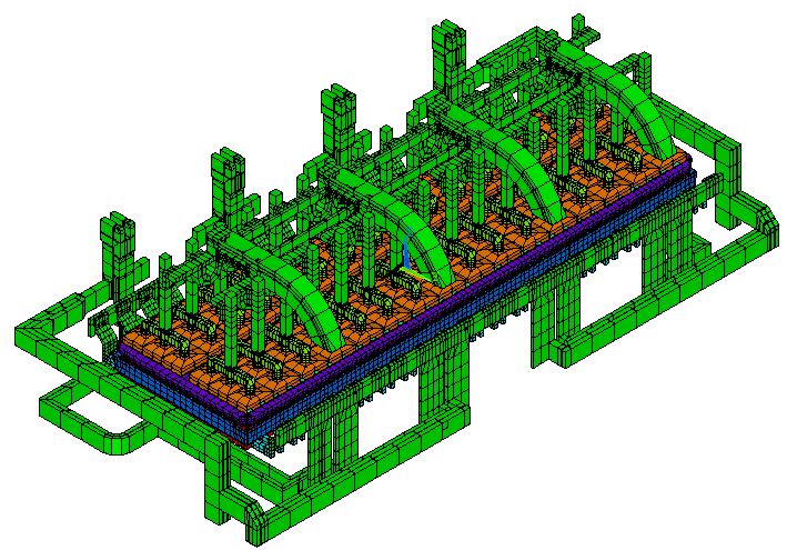 Despite the very serious limitations on the size of the mesh, a full cathode corner (Reference 3) was built next, more to demonstrate the capability to do so than to actually use the model as a design tool as the model turn around time was not at all convenient!