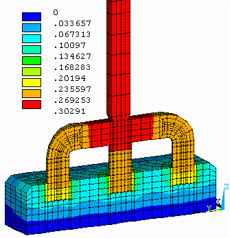 Figure 5: Voltage solution from a typical model And again, the global heat dissipation must be calculated with the use of a user´s macro. Yet this time, the calculation involves the extrapolation of the center section results into the full cathode e.g. it must incorporate into the calculation the effect of the end wall and corner heat losses. This is achieved by asking the user to provide an extrapolation factor to account for those extra losses (see Table 2). This time the greatest modeling challenge involves the calculation as part of the model solution of the thickness of the frozen layer of electrolyte that forms on the internal walls of the cathode. This problem is tackled by another user´s defined macro that performs multiple solutions by iterating between the preprocessing phase and the postprocessing phase until the shape of the ledge layer is compatible with both the melting surface temperature and the melting heat flux boundary conditions [6]. |
