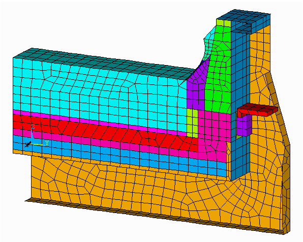 Figure 4: Typical cathode side slice model That cathode slice is made of a steel shell structure represented by shell elements, many rows of different types of lining bricks on top of which sits a thick layer of carbon material. This carbon layer is put in the cell in sections called cathode carbon blocks. To carry the current out of the cell, a steel collector bar is inserted in grooves made in the bottom face of the carbon cathode blocks. Again, cast iron is used to seal the joint between the carbon blocks and the steel collector bar. The internal vertical walls are made of either carbon side blocks or silicone carbide side blocks. |