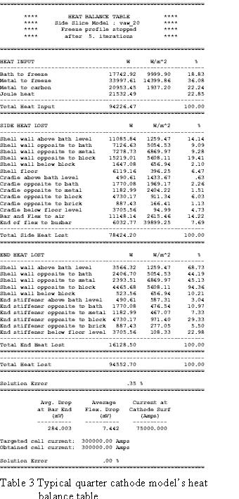 Table 4 presents a typical measurement sheet of a thermal blitz similar to those carried out at Lauralco´s smelter in order to provide the data to validate the models. Table 5 shows typical results obtained out of a thermal blitz exercise: the experimental heat balance table in the same format as the one produced by the model for easy comparisons.