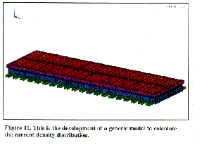 Figure 11 shows the development of a generic model to calculate the current density distribution. With the enhancements made to APDL introduced at ANSYS Revision 5.0, it was possible to develop a generic parametric model of a reduction cell. The model generation, solution, and postprocessing were automated. The user input was limited to parameter values that define the cell characteristics and boundary conditions. Alternative designs could be easily analyzed and optimized using the model. The evaluation of the Lorentz forces in the metal pad is shown in Figure 12. The introduction at ANSYS Revision 5.0 of the generalized potential approach for solving magnetic field problems and the |