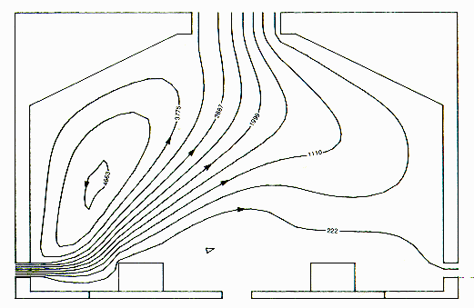 Les résultats expérimentaux sont montrés à la figure 2. Le profil d'écoulement, réalisé qualitativement à partir de d'observation directe des films de la maquette, est en bonne concordance avec les lignes de courant obtenues à partir des lectures de vitesse dans la maquette. Les deux interprétations de l'écoulement mettent en évidence les six boucles de recirculation et les courants descendants au-dessus de chaque cuve. L'écoulement au-dessus des entrées est non-stationnaire tandis que l'écoulement au-dessus des cuves est stationnaire. I1 faut cependant souligner que deux types d'écoulement ont pu être observés près des murs de la maquette. Le premier type, où les jets d'air des entrées latérales moment directement au plafond, a été observé pendant moins d'une heure après le départ de la convection forcée. Après cette période, l'écoulement se transforme irréversiblement et adopte le deuxième type où les jets latéraux s'inclinent vers les murs par l'effet Coanda. Trois simulations ont été réalisées avec le modèle mathématique soient: sans aucun modèle de turbulence, avec le modèle algébrique et avec le modèle K-e . La figure 3 montre les résultats calculés. Sans modèle de turbulence, les trois jets d'air provenant des entrées se dirigent directement au plafond et les recirculations au-dessus de chaque cuve sont asymétriques. Le modèle algébrique a amélioré les résultants légèrement et le modèle K-e a simulé presque le même écoulement que celui de la maquette. Une comparaison quantitative entre ces simulations est démontrée au tableau 1.