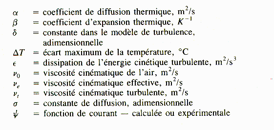 Dans ces travaux, la géométrie était relativement simple et le but était d'explorer les différents écoulements possibles dans les systèmes simultanément en convection forcée et naturelle. Par contre, Dupuis et al. (1985) se sont adressés à un problème industriel, soit l'écoulement turbulent de l'air dans une enceinte semblable à une salle de cuves. Seulement un modèle algébrique de turbulence a été utilisé et la géométrie de l'enceinte était rectangulaire. Ici, nous reprenons le travail de Dupuis et al. (1985) et nous présentons un résumé des travaux de recherches sur la simulation mathématique avec des modèles de turbulence de diverses complexités dans une enceinte à toit incliné. Le modèle d'écoulement Le fluide a été considéré comme incompressible et l'hypothèse de Boussinesq pouvait encore être appliquée dans les conditions thermiques de l'enceinte (Gray et Giorgini, 1976). Les équations différentielles de la vorticité, de la température et de la fonction de courant forment le modèle mathématique de l'écoulement bidimensionnel (Anderson et al., 1984). Ces équations ont été résolues par une méthode transitoire en différences finies. Le modèle emploie la méthode ADI pour résoudre les équations de la vorticité et de la température. La méthode SOR a été utilisée pour résoudre |