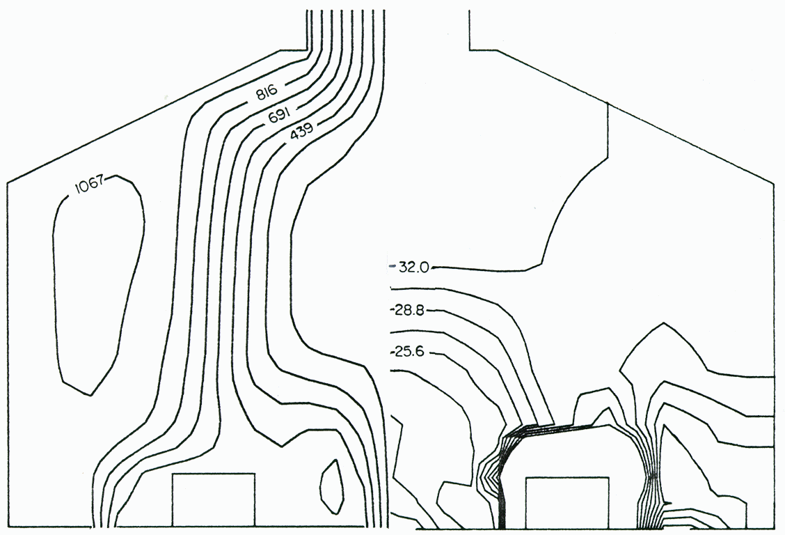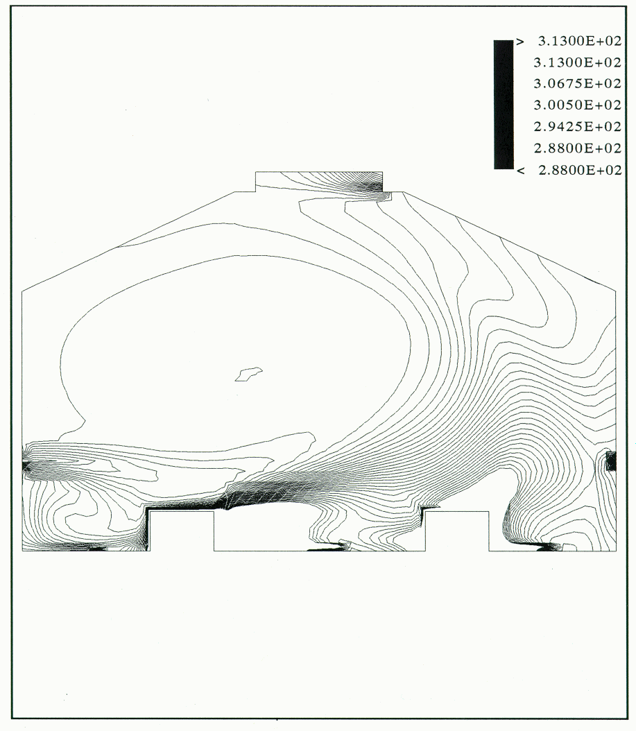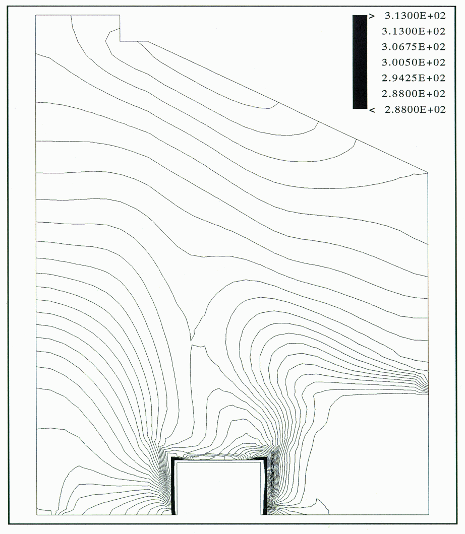 With the K-E turbulence model the flow pattern was similar to that observed in the physical model (Figure 6). However, the influence of the flow from the sidewall was overpredicted, since the thermal plume was pushed too much towards the center of the building. The isotherms show a narrow plume inclined at 45 ° and at a high temperature of 40 °C.