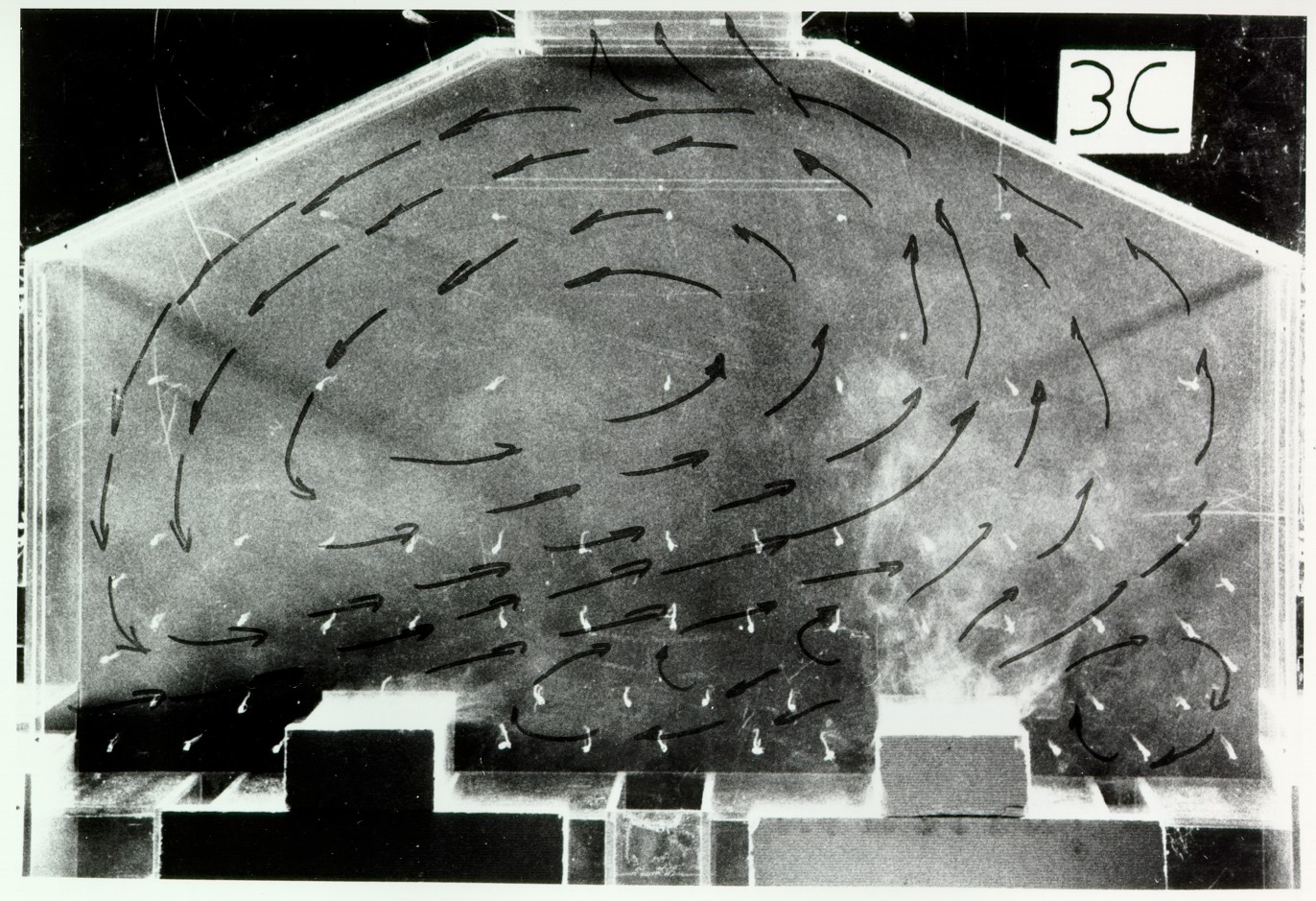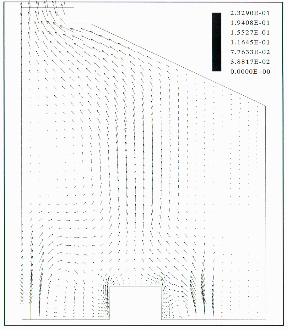 In this case the effect of wind was simulated by increasing the flow through the sidewall opening on the left side of the building model. The flow in the entire cell room was simulated, since the flow pattern was no longer symmetric with respect to the centerline. The experimental data showed that the thermal plume above the cell model on the left was flattened and the thermal plume above the cell model on the right was inclined towards the right (Figure 8). A large recirculating loop existed under the roof. The isotherms indicated a cool zone of 29 °C on the left side of the building and a warm zone of 34 °C on the right side of the building.