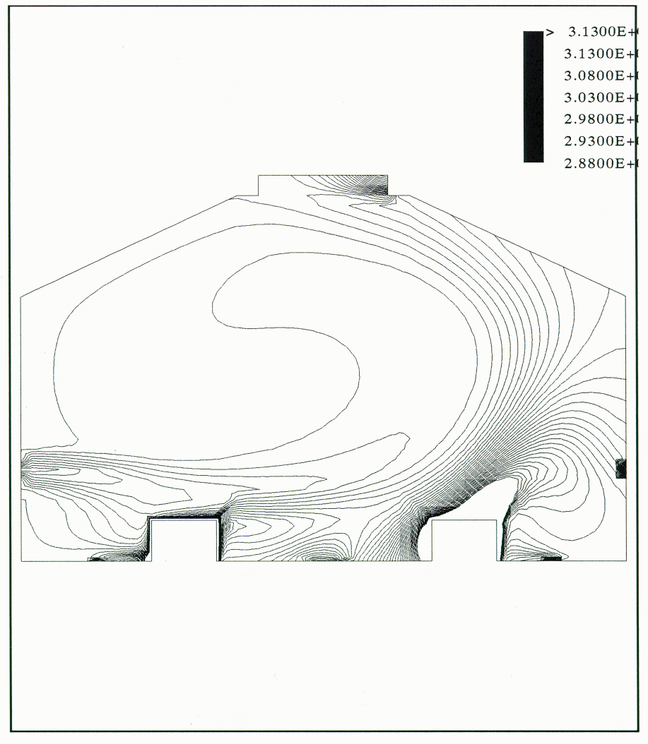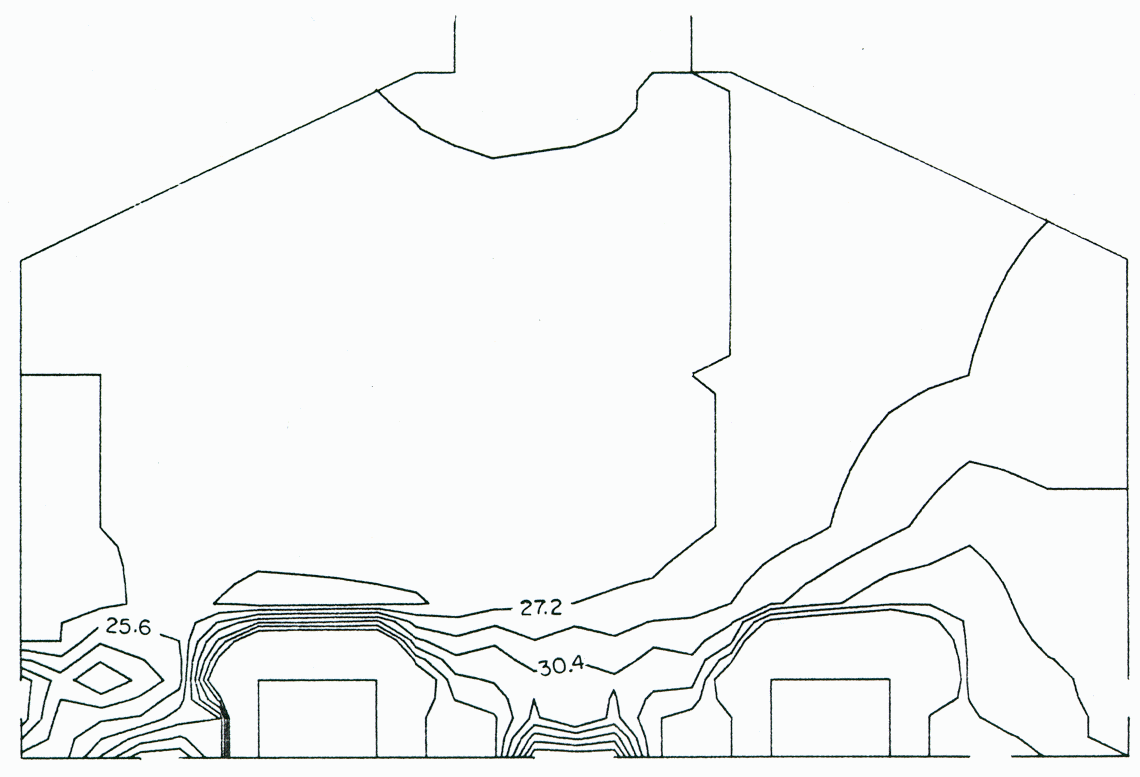 The Reynolds flux turbulence model also predicted the flow pattern fairly well (Figure 10). The isotherms showed a cool zone of 27 °C on the left and a warm zone of 34 °C on the right. The thermal plume above the cell model on the right was more effective than that of the K-E turbulence model. The temperatures near the floor were higher than those of the K-E turbulence model or those of the experimental data.