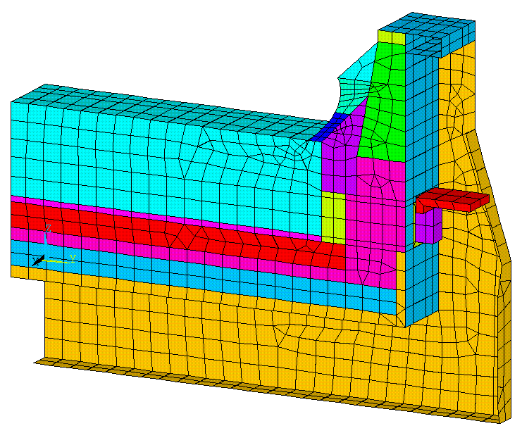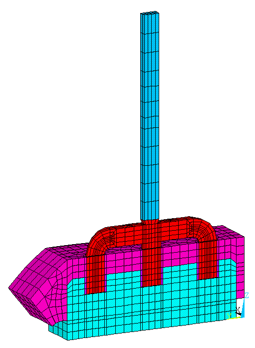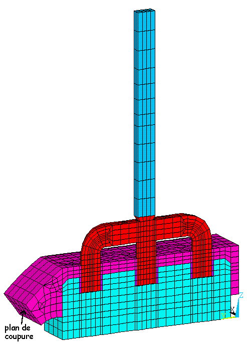 On retrouve à la figure 12 le maillage du modèle de tranche de cathode, les différentes couleurs représentant les différents types de matériaux.
