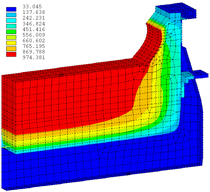 La solution thermique de la croûte (en particulier au niveau du canal latéral) permet de mettre en évidence l´impact d´utiliser une propriété qui varie en fonction de la température. En effet, la croûte est définie comme un bon isolant jusqu´à 600 °C, mais comme un mauvais isolant au-dessus de 600 °C (ce qui correspond en fait à définir les propriétés de deux matériaux dans un seul et de laisser le programme calculer la position de l´interface entre les deux). On peut observer le résultat en notant que les isothermes à la surface de la croûte sont très rapprochés jusqu´à ce que la température atteigne 600 °C.