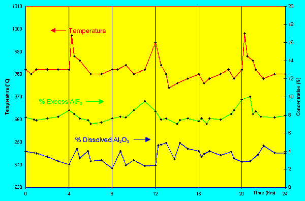 Les données de température, de concentration d´AlF3 et d´alumine dissoute dans le bain ont été mesurées en moyenne à toutes les heures sur une période de 24 heures. Durant cette journée de mesure, on a observé 3 effets anodiques tel que l´on peut le constater à la figure 1.