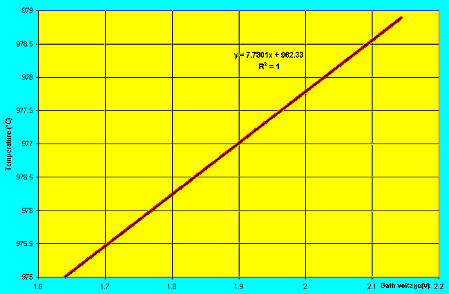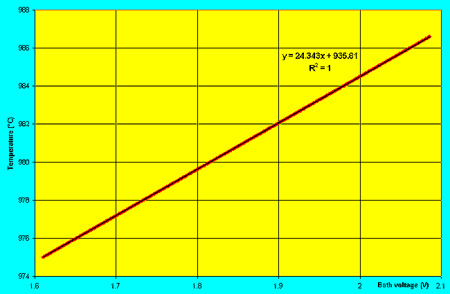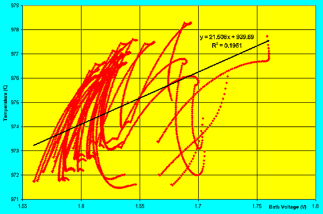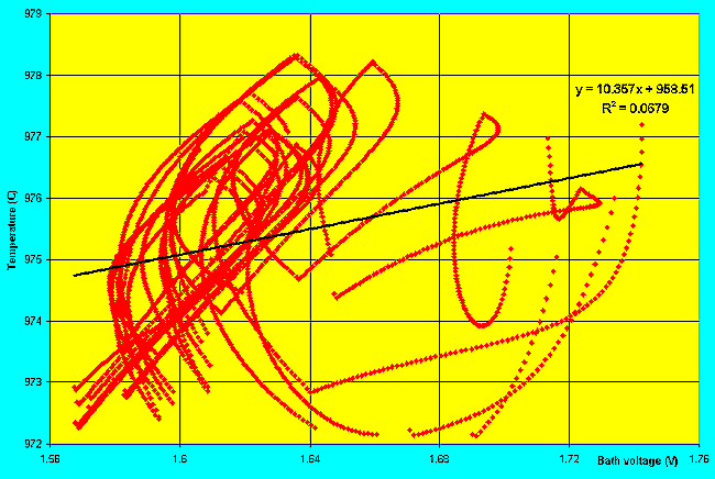 Malheureusement, étant donné qu´une cuve en opération n´est jamais vraiment parfaitement en équilibre thermique, il n´est pas évident d´obtenir une corrélation significative entre le voltage dans le bain et la température d´opération (que l´on assume être la température d´équilibre).