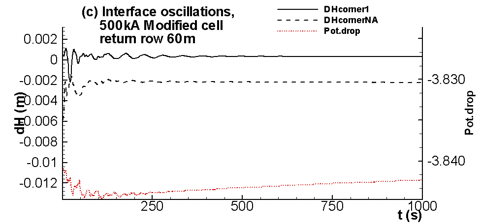 The electromagnetically self-sustained wave and voltage oscillation pattern for the cell is a measure for the cell operation stability. Typically almost all commercial cells even of low amperage 80-100 kA exhibit some rolling wave noise which we can detect also with the present MHD simulation package. Our experience with commercial cell modeling showed the presence of this sustained noise in almost all cell types even at low levels. The present 'Modified' 500kA cell shows relatively low amplitude signal (Figure 10 a,b) at a well defined frequency about 0.017 Hz, which is between 3rd and 4th gravitational self frequencies for this cell. However, a very remarkable result is achieved when moving the return current line to 60 m - the oscillation is completely damped out (Figure 10 c). Therefore we could expect that this cell will be a very good candidate for a commercial implementation, at least from the point of view of the MHD. The initial 'New' cell design was far from this very stable condition, as can be seen from Figure 10 d. Note, also the predicted voltage oscillation detectable from this model, and which can not be detected by the many other MHD models.