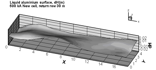 A 'stationary' interface shape in practice is never achieved, because the real cells operate in transient regimes. Even the MHD rolling wave noise is quite typical for many cells. The 'New' 500 kA cell shows quite considerable wave pattern and the Figure 11a presents the interface shape at a particular time moment 500 s from the simulation start. Clearly the 'Modified' version of the cell has much better interface shape of lower amplitude (Figure 11b). Here the small humps and depressions are created by the pressure differences in the two layers owing to the difference in the turbulent large scale recirculation patterns. When the return current line was moved to 60 m distance, the interface can achieve a shape which is practically stationary and of very little deformation as shown in the Figure 11c.