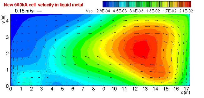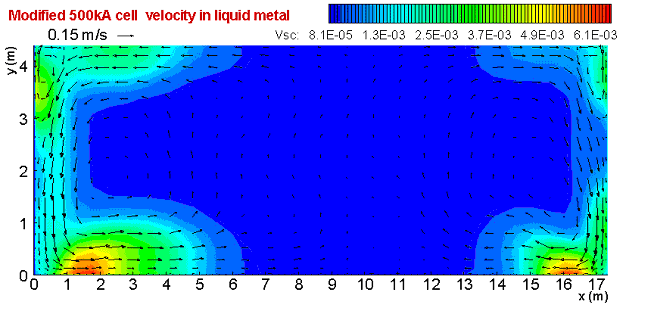 The horizontal velocity field is not damped, as shown in Figure 12, even for the stable 'Modified' cell. However, the turbulent average velocity pattern is relatively symmetric and it is very similar both in the liquid metal and the electrolyte, therefore the horizontal flow generated pressure distribution is also well compensated at the interface and no significant additional deformation is created for the stable cell.