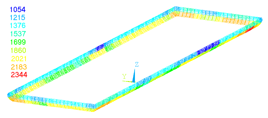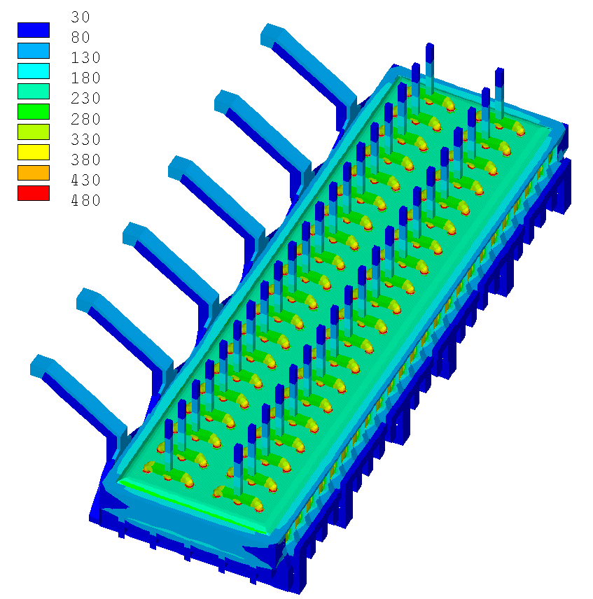 The bus arrangement and their cross-sections were additionally optimized also for the electric current distribution uniformity over the cathode collectors, including the 50:50 split for the upstream and downstream currents. The current distribution in the liquid aluminium is shown in the Figure 9, where the ledge toe profile can be seen as input from the coupled thermoelectric model.