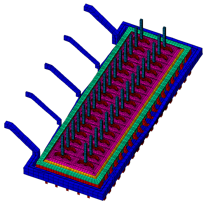 Figure 1 presents the coarser 249,322 elements mesh that could finally actually be solved. The P4 3.2 GHz computer took 63.7 CPU hours to solve the model once (see the thermal solution in figure 2). Since it took so long to solve, no attempt to converge the ledge profile geometry has been performed.