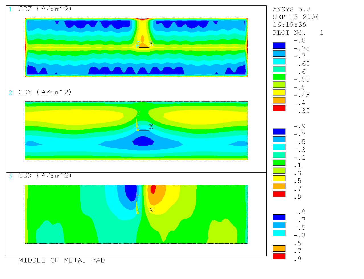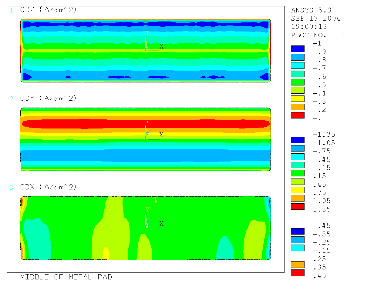 The P4 computer took "only" 40.6 CPU hours to solve the model 6 times (i.e. the initial solution plus 5 loops of the ledge profile geometry convergence scheme, see figure 5 for the thermal solution). Figure 6 presents the computed current density in the metal pad.