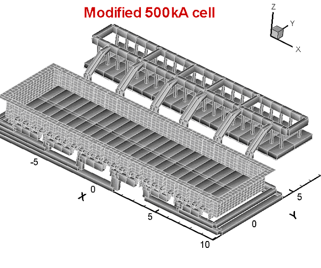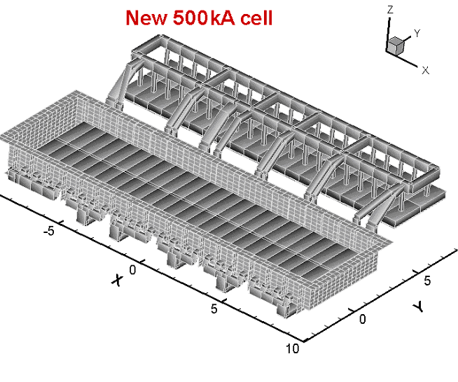 More recently, the mesh of a 3D full cell and external bus-bar thermo-electric model of a 500 kA cell has been presented (see figure 6 of [2]). That 585,016 element model could not be solved either, even on a P4 3.2 GHz computer with 2 GB of RAM.
