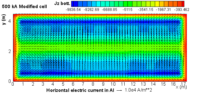 More work has been done to optimize the bus-bar arrangement for our 'New' 500 kA cell [2], which actually was only marginally stable and not suitable for practical industrial implementation. The current carrying bus arrangement is shown in Figure 7 together with the steel parts used in the present simulations. The same figure (bottom part) shows the modified bus arrangement which ensures significant reduction of the overall magnetic field, especially the vertical Bz component. Figure 8 demonstrates the comparisons with the previous cell ('New') and the 'Modified' cell total magnetic fields. For such a high amperage cell (500 kA) the magnetic field is well compensated for the 'Modified' cell, the average magnitude of the vertical field being about 0.0012 T. It needs to be mentioned that the parallel row of the cells carrying the return current is positioned very close at 20 m free space between the rows. If this space is increased to 60 m, the vertical field average magnitude is reduced to 0.0008 T which brings the cell in a very favorable MHD regime when even the theoretical stability limits are satisfied.