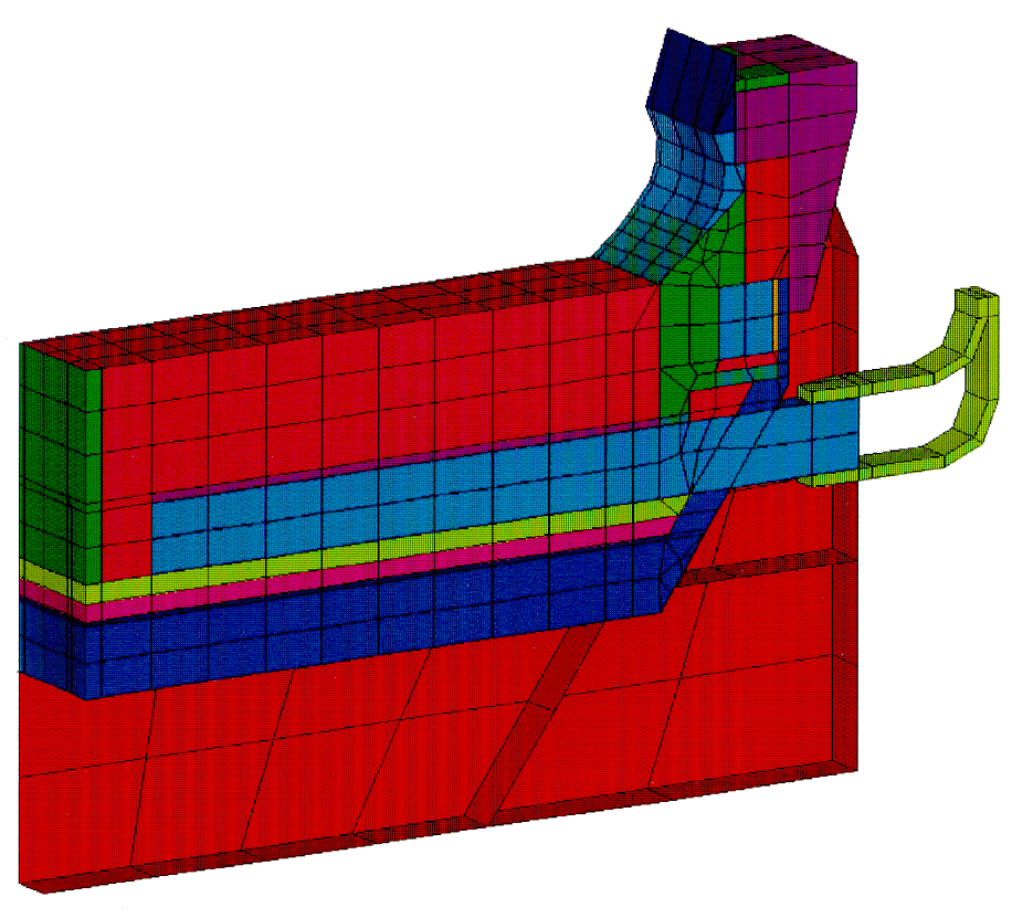 The complex geometry and generation of heat within the cathode lining makes a combined calculation of the heat and current flow by finite element methods desirable. A thermo-electric model allows for the calculation of the location of isotherms in the lining, the freeze profile and the heat dissipated by the cathode. After validation of the model results against measurements obtained from thermo-electric "blitz" campaigns, the model can be used to investigate changes in the lining materials as well as changes in the process parameters. Quarter Model Description The cell technology used at the Grande-Baie smelter, with its sloped potshell side wall, its curved potshell end wall and its intricate pier design, has one of the more complex cathode lining geometries in the aluminum industry (Figure 1). The representation of such a complex geometry by a parametric finite element model proved to be quite an undertaking, especially in the corner zone between the side and end wall designs.