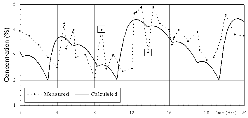 Figure 5: Measured vs. calculated alumina concentration. Note that there seem to be two points in the measured data (figure 5) which are not consistent with the expected behavior of the cell. These are close to the 9 and 14 hour mark and should be discarded. The comparison of the % excess AIF3 dynamic evolution is presented in figure 6. Two observations are noted: