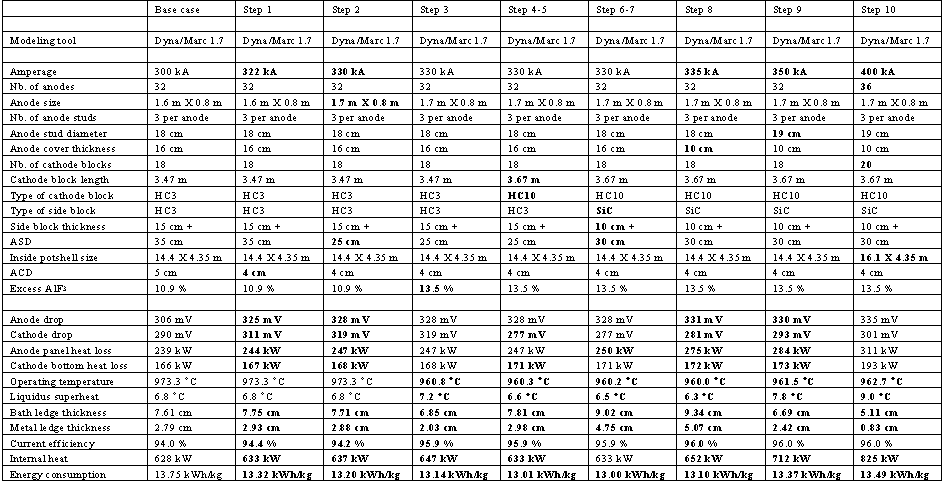 The retrofitted 350 kA cell design is then extended into a 400 kA cell by increasing the cell length by 1.7 m, going from 14.4 to 16.1 m, to be able to add four new anodes and two new cathode blocks. The summary of the results obtained is presented in table I.