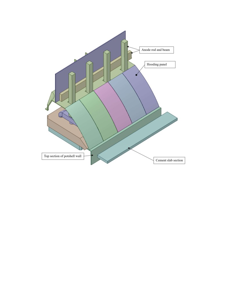 A full 3D model of a section of a Hall-Héroult anode cover and hooding system was developed