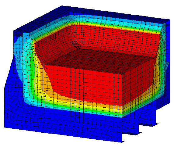 Another important feature of a model topology is that it is subdivided in regions (volumes in 3D space). Each region is then assigned to a material type and each material type is assigned to a set of non-linear (temperature dependent) material properties. So, it is quite easy to change, for example, the grade of the cathode block in the model. In such a case, only the set of non-linear material properties associated to the cathode block region has to be changed.