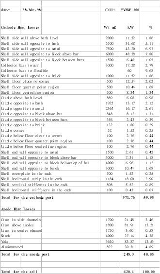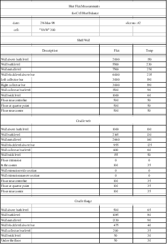 Table 4 presents a typical measurement sheet of a thermal blitz similar to those carried out at Lauralco´s smelter in order to provide the data to validate the models. Table 5 shows typical results obtained out of a thermal blitz exercise: the experimental heat balance table in the same format as the one produced by the model for easy comparisons.