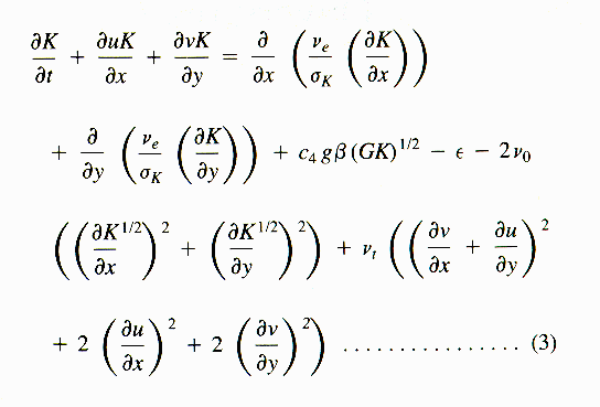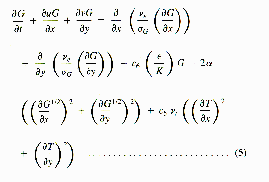 Étant donné que le présent écoulement est laminaire près des parois et turbulent au-dessus des cuves, le modèle K-e-G modifié pour l'écoulement à nombre de Reynolds faible a été adopté (Plumb et Kennedy, 1977); il comprend les équations suivantes: Énergie cinétique turbulente K: