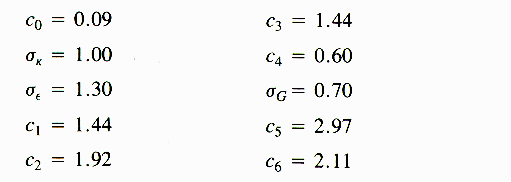 Ce modèle de turbulence ajoute trois équations différentielles à résoudre et comprend dix constantes à ajuster. Toutefois, l'expérience a démontré que ces constantes varient moins d'un écoulement à l'autre que les constantes des modèles algébriques. Les valeurs suivantes ont été tirées de la littérature (Spalding, 1971; Plumb et Kennedy, 1977) et ont été utilisées dans ces travaux: