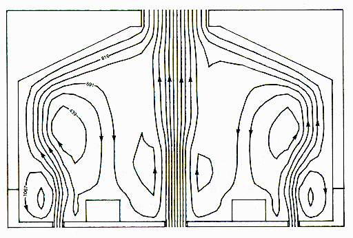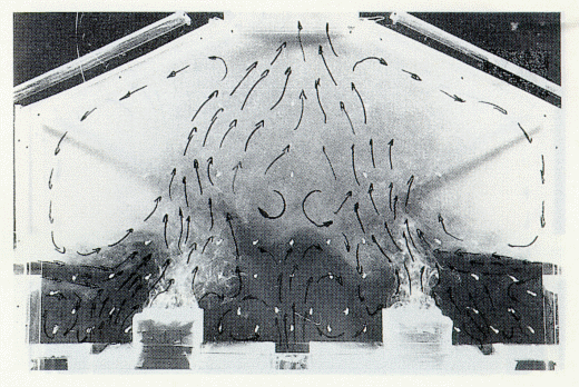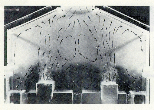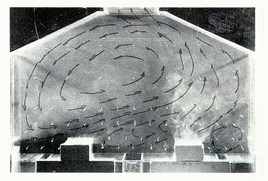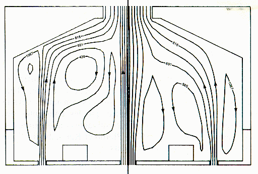Les résultats expérimentaux sont montrés à la figure 2. Le profil d'écoulement, réalisé qualitativement à partir de d'observation directe des films de la maquette, est en bonne concordance avec les lignes de courant obtenues à partir des lectures de vitesse dans la maquette. Les deux interprétations de l'écoulement mettent en évidence les six boucles de recirculation et les courants descendants au-dessus de chaque cuve. L'écoulement au-dessus des entrées est non-stationnaire tandis que l'écoulement au-dessus des cuves est stationnaire. I1 faut cependant souligner que deux types d'écoulement ont pu être observés près des murs de la maquette. Le premier type, où les jets d'air des entrées latérales moment directement au plafond, a été observé pendant moins d'une heure après le départ de la convection forcée. Après cette période, l'écoulement se transforme irréversiblement et adopte le deuxième type où les jets latéraux s'inclinent vers les murs par l'effet Coanda. Trois simulations ont été réalisées avec le modèle mathématique soient: sans aucun modèle de turbulence, avec le modèle algébrique et avec le modèle K-e . La figure 3 montre les résultats calculés. Sans modèle de turbulence, les trois jets d'air provenant des entrées se dirigent directement au plafond et les recirculations au-dessus de chaque cuve sont asymétriques. Le modèle algébrique a amélioré les résultants légèrement et le modèle K-e a simulé presque le même écoulement que celui de la maquette. Une comparaison quantitative entre ces simulations est démontrée au tableau 1.