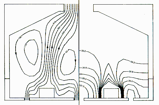 Figure 5 - CAS 2: L'écoulement simulé (partie gauche) et les isothermes simulées (partie droite) a) aucun modèle de turbulence b) modèle algébrique de turbulence c) modèle K-e-G de turbulence Une modification a été apportée au modèle algébrique en ajoutant un terme pour la convection naturelle: