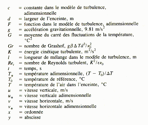 Dans ces travaux, la géométrie était relativement simple et le but était d'explorer les différents écoulements possibles dans les systèmes simultanément en convection forcée et naturelle. Par contre, Dupuis et al. (1985) se sont adressés à un problème industriel, soit l'écoulement turbulent de l'air dans une enceinte semblable à une salle de cuves. Seulement un modèle algébrique de turbulence a été utilisé et la géométrie de l'enceinte était rectangulaire. Ici, nous reprenons le travail de Dupuis et al. (1985) et nous présentons un résumé des travaux de recherches sur la simulation mathématique avec des modèles de turbulence de diverses complexités dans une enceinte à toit incliné. Le modèle d'écoulement Le fluide a été considéré comme incompressible et l'hypothèse de Boussinesq pouvait encore être appliquée dans les conditions thermiques de l'enceinte (Gray et Giorgini, 1976). Les équations différentielles de la vorticité, de la température et de la fonction de courant forment le modèle mathématique de l'écoulement bidimensionnel (Anderson et al., 1984). Ces équations ont été résolues par une méthode transitoire en différences finies. Le modèle emploie la méthode ADI pour résoudre les équations de la vorticité et de la température. La méthode SOR a été utilisée pour résoudre |