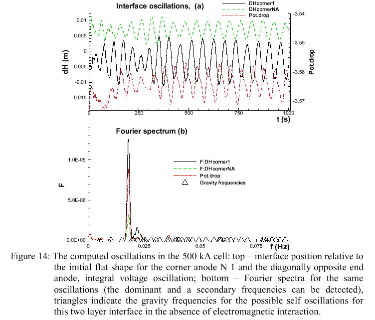 With all these effects included, the cell MHD behavior is stable; however the wave is not eliminated completely in this case, remaining at about 1 cm amplitude above the initial flat surface. The oscillation patterns beneath the first corner anode and the diagonally opposite far corner anode are shown in the top part of the Figure 14. The respective anodic currents fluctuate in the same manner. The Fourier spectrum for this oscillation indicates a dominant frequency between the third and fourth gravitational frequencies, which is shifted, owing to the MHD interaction, from the purely hydrodynamic oscillation frequencies, as it is explained in [10].