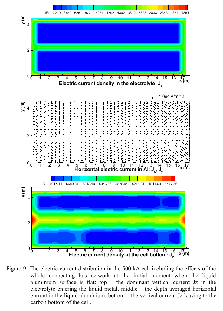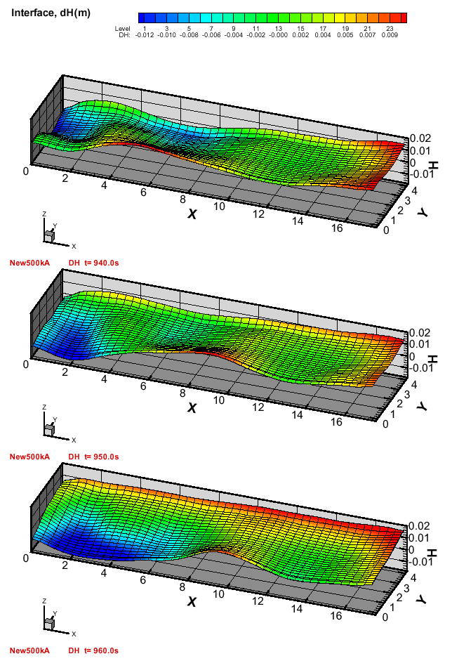 There are more subtle interactions which are included in the model. One of these is the horizontal large scale circulation influence on the interface deformation: a large scale horizontal vortex will create a considerable free surface dip in its center. Since the circulation pattern in the aluminium layer is different from the electrolyte, the interface adjusts to the pressure deviation created by the large horizontal vortices. The other important effect included in the MHD model is the additional electric current generated by the moving liquid metal (of high electrical conductivity) in the quite strong magnetic field for the case of 500 kA and higher amperage. This second effect is stabilizing the cell fluid dynamics.