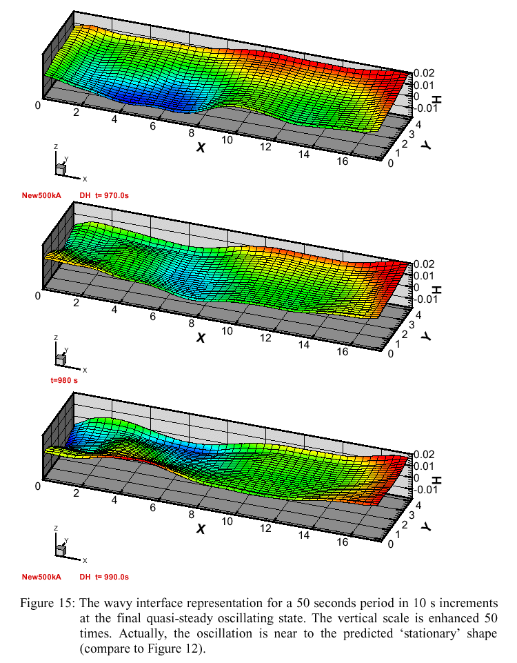 The nature of the wave is illustrated for one complete period (about 50 s) in Figure 15, showing the highly exaggerated interface deformation (the scale in z-direction is enhanced 50 times) at 10 second intervals at the end of simulation when a well established turbulent fluid flow is predicted. There is a very small (but detectable in measurements) cell voltage oscillation (Figure 15) which is the result of the integral resistivity change for the ACD during the wave motion.