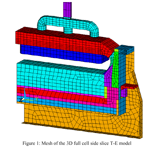 In the context of the present study, the next priority was rather the extension of the 3D full cell side slice model into a full cell quarter including the liquid zone thermo-electric model (see figure 2).