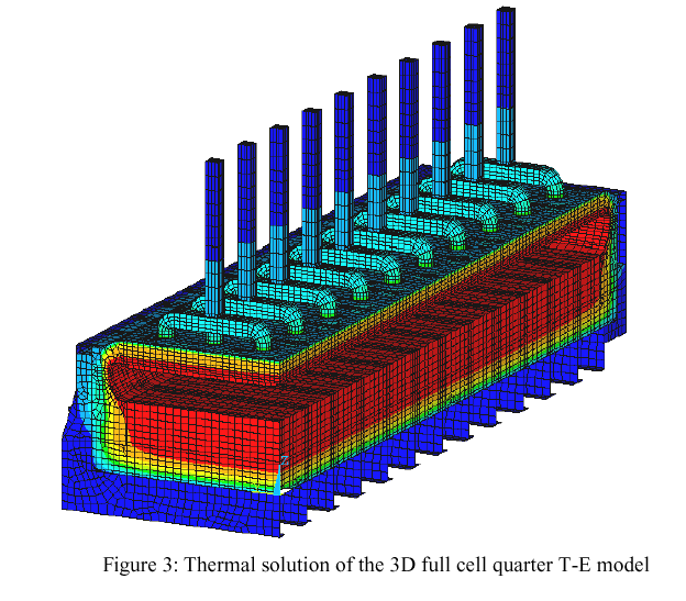 Figure 1 shows the mesh of the 3D full cell side slice thermo-electric model that can be used to accurately compute the cell heat balance. In that model, a 3 studs (20.5 cm in diameter) anode design is used while it was recommended to use a 4 studs (17.5 cm in diameter) design in the preliminary study [6]. The 4 studs design has not been modeled so far, because this type of anode model topology was not readily available.