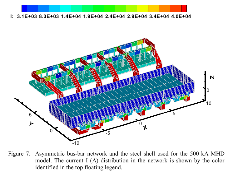 The next phase of 3D thermo-electric model development would be the full cell half with busbar model [4]. On its own, the busbar design already involves both the MHD and thermo-electrical models as the busbar layout is dictated by MHD cell stability model results, yet the busbar sizing is done using a thermo-electric model. By adding the busbar thermo-electric model to a full cell half thermo-electric model we can analyze the impact of an imperfectly balanced busbar on the metal pad current density (assuming that the busbar is symmetric).
