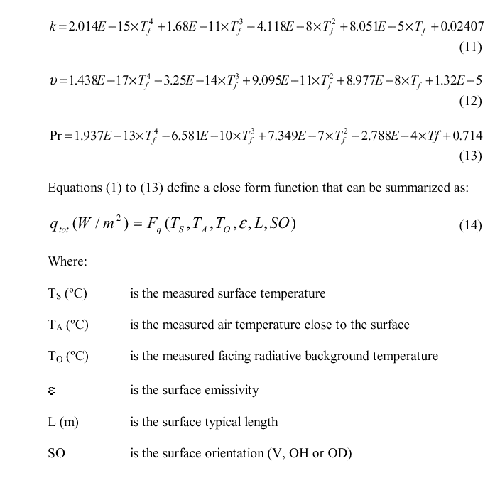 Instead, the fundamental natural convection and radiation heat flux equations were used systematically for each measurement point. Practically, this means that the ambient air temperature and at least one ambient radiative temperature must also be known in addition to the surface temperature for each measurement point. Sometimes, the radiative heat flux could not be accurately estimated using a single ambient radiative temperature. In those cases, a more accurate estimation based on two ambient radiative temperatures and corresponding view factors has been used instead.