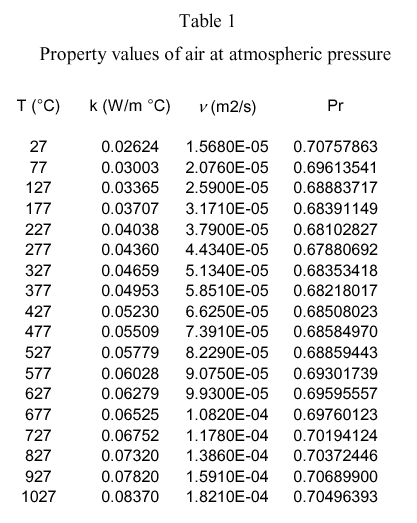 Finally, by fitting the data of Table 1 with 4 order polynomials, we can establish the following equations for the air thermal conductivity, the air cinematic viscosity and the air Prandtl number respectively: