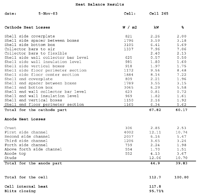 The concept of the cell heat balance is quite simple. Of the total electrical power fed to the cell, less than half is actually used to produce aluminium. The remaining part must be dissipated as heat losses by the cell in order for it to maintain its thermal equilibrium. Experimentally, a cell voltage break down is required in order to calculate the cell internal heat i.e. the heat that the cell needs to dissipate to maintain its thermal equilibrium. In turn, this can be experimentally confirmed by directly measuring the cell heat losses. If the cell heat losses correspond to the calculated cell internal heat, those measurements can be used with confidence in order to calibrate the mathematical models of the cell.