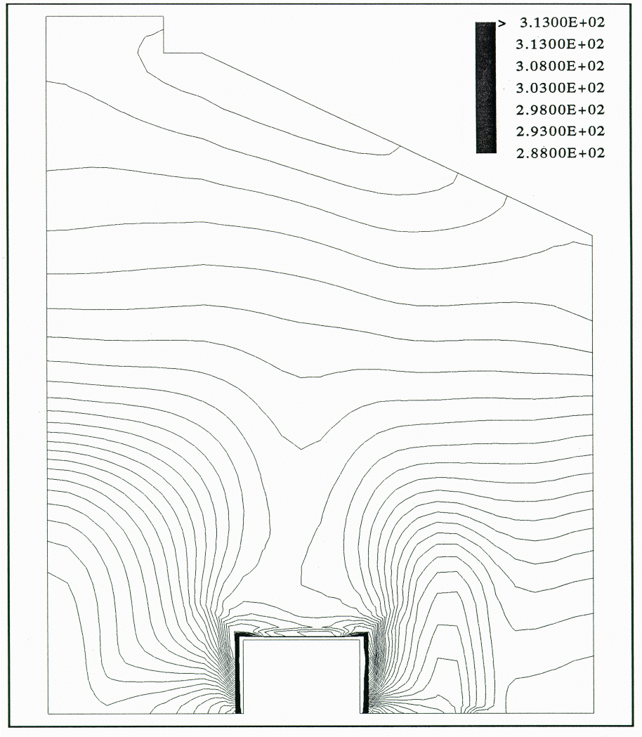 With the K-E turbulence model the flow pattern was similar to that observed in the physical model (Figure 6). However, the influence of the flow from the sidewall was overpredicted, since the thermal plume was pushed too much towards the center of the building. The isotherms show a narrow plume inclined at 45 ° and at a high temperature of 40 °C.