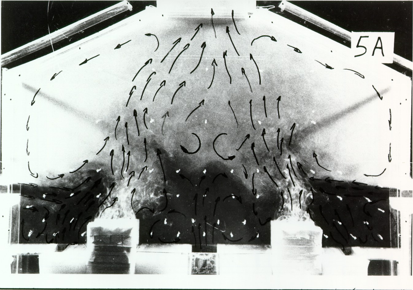In this case the sidewall openings were open and fresh air entered through all the inlet openings. The experimental data are shown in Figure 5. Due to the flow from the sidewall openings, the thermal plume above the cell model was inclined at 20° towards the center of the building model. There was a large recirculating loop under the roof and a small recirculating loop above the center floor opening. The isotherms showed steep temperature gradients near the cell model with a small peak of 32 °C above one edge of the cell model the temperatures were almost constant under the roof.