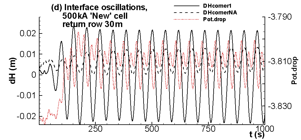 Figure 9: Electric current distribution in the liquid metal computed with the MHD model and the ledge position input from the Thermoelectric model: arrows show the horizontal depth averaged current, contour levels - vertical current on the bottom from the top view point. The electromagnetically self-sustained wave and voltage oscillation pattern for the cell is a measure for the cell operation stability. Typically almost all commercial cells even of low amperage 80-100 kA exhibit some rolling wave noise which we can detect also with the present MHD simulation package. Our experience with commercial cell modeling showed the presence of this sustained noise in almost all cell types even at low levels. The present 'Modified' 500kA cell shows relatively low amplitude signal (Figure 10 a,b) at a well defined frequency about 0.017 Hz, which is between 3rd and 4th gravitational self frequencies for this cell. However, a very remarkable result is achieved when moving the return current line to 60 m - the oscillation is completely damped out (Figure 10 c). Therefore we could expect that this cell will be a very good candidate for a commercial implementation, at least from the point of view of the MHD. The initial 'New' cell design was far from this very stable condition, as can be seen from Figure 10 d. Note, also the predicted voltage oscillation detectable from this model, and which can not be detected by the many other MHD models. A 'stationary' interface shape in practice is never achieved, because the real cells operate in transient regimes. Even the MHD rolling wave noise is quite typical for many cells. The 'New' 500 kA cell shows quite considerable wave pattern and the Figure 11a presents the interface shape at a particular time moment 500 s from the simulation start. Clearly the 'Modified' version of the cell has much better interface shape of lower amplitude (Figure 11b). Here the small humps and depressions are created by the pressure differences in the two layers owing to the difference in the turbulent large scale recirculation patterns. When the return current line was moved to 60 m distance, the interface can achieve a shape which is practically stationary and of very little deformation as shown in the Figure 11c. The horizontal velocity field is not damped, as shown in Figure 12, even for the stable 'Modified' cell. However, the turbulent average velocity pattern is relatively symmetric and it is very similar both in the liquid metal and the electrolyte, therefore the horizontal flow generated pressure distribution is also well compensated at the interface and no significant additional deformation is created for the stable cell. |