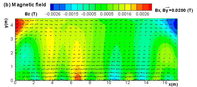 An additional upgrade was made to the MHD model by including the ferromagnetics model directly in the full MHD simulation package. There is no need any more to run a separate ferromagnetics program in order to account for the effect of the steel parts magnetization. Instead the present model constantly updates the magnetic field with the magnetization effects by using a fast converging iterative magnetic field solver. This solver has no limit on the ferromagnetic element number dictated by the computer memory restrictions because the influence matrix is not stored. The nested iteration procedure is implemented in such a way that convergence for non-linear material properties and the element mutual interaction is achieved in few iterations. The initial step convergence also is relatively fast (typically in less than 100 iterations). The user of the MHD program package can input the whole steel parts (plates) and the magnetization curve (either measured for the specific materials or taken from the literature). In the present runs we used about 3500 steel elements, and tests with 10 000 elements confirmed no significant change.